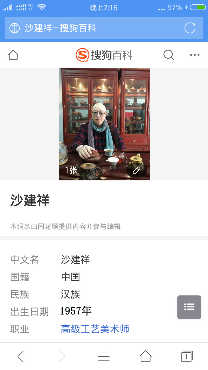 沙建祥,男,国家级紫砂艺术大师、江苏省工艺美术大师、国家级工艺美术师、为国家标准《紫砂陶器》(GB/T1989)参订人、《宜兴紫砂泥料标准》制定专家组成员